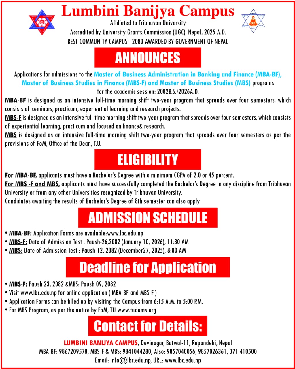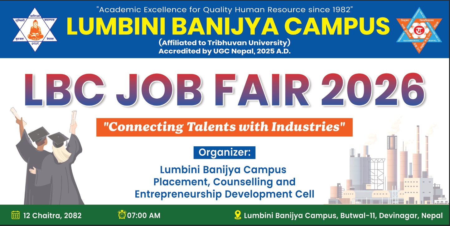 Lumbini Banijya Campus was formally inaugurated on 20th February, 1982. Initially the campus was run in Butwal Municipality Building at Ward No. 1 to run PCL classes in morning shift. Later B.Com classes were started in 1986 with 42 students in first year. The Campus got approval to run MBS classes in 2001 phasing out the PCL. For its quality in academic field the campus got quality accreditation certificate from University Grants Commission Nepal. After the accreditation, the campus was approved to run BBM under the affiliation of T.U. in 2014 and MBA-BF in 2017 as an autonomy. The campus is well equippied with library, e-library, computer labs and all other necessary factors that is required to provide academically sound environment for the students. The Campus is not only dedicated academically but also with field works and research to provide students with practical scenarios of today's business environment.