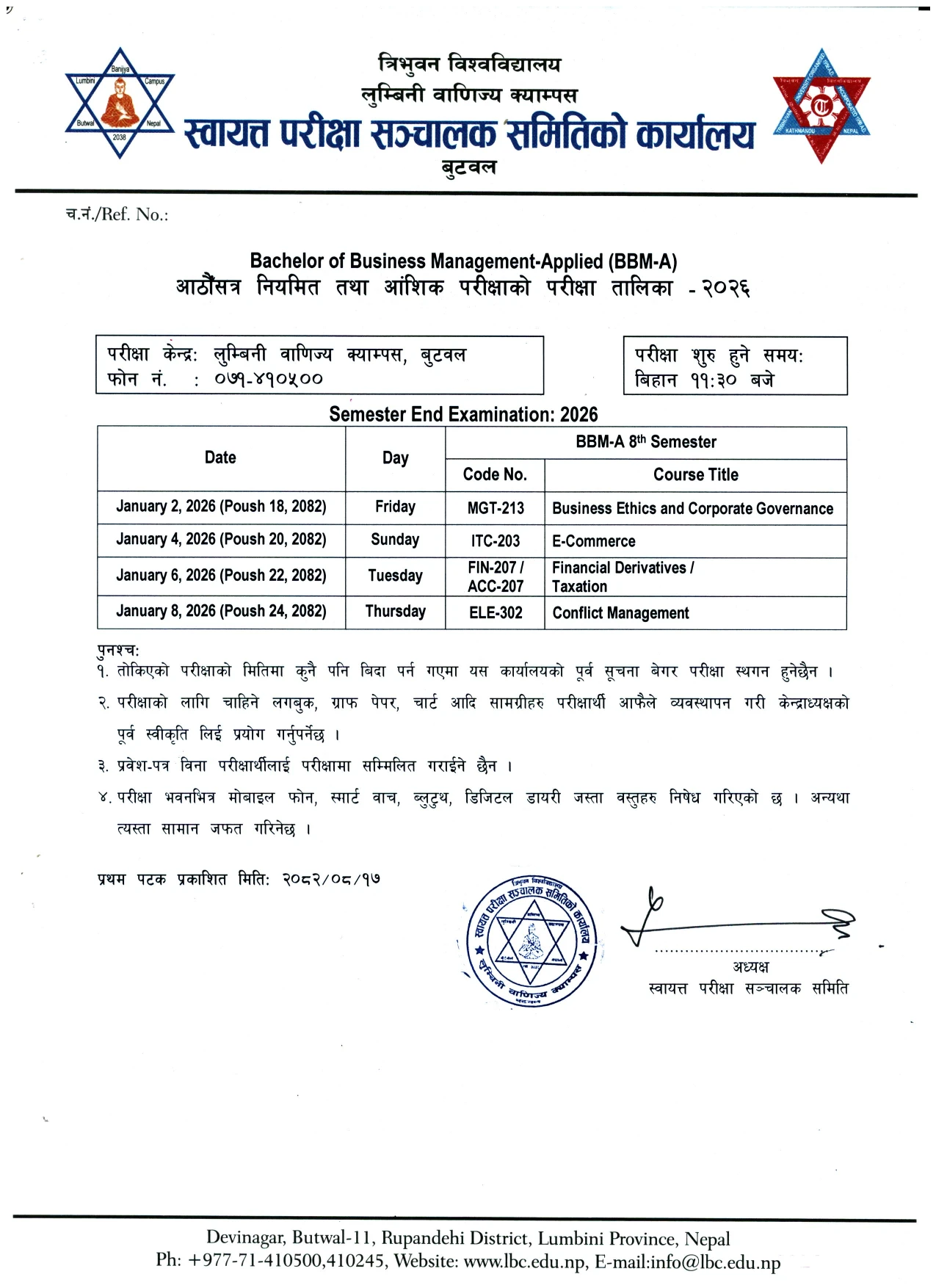 MBS and MBS-F छात्रवृत्ति छनोट सम्बन्धी सूचना MBA-BF (Fall) तेस्रोसत्र तथा प्रथमसत्र सत्रान्त परीक्षाको नियमित तथा आंशिक परीक्षा फारम भर्ने सम्बन्धी सूचना MBA-BF चौथोसत्र नियमित तथा आंशिक परीक्षाको परिक्षा तालिका - २०२६ MBS-F चौथोसत्र नियमित तथा आंशिक परीक्षाको परिक्षा तालिका - २०२६ BMS आठौँसत्र नियमित तथा आंशिक परीक्षाको परिक्षा तालिका - २०२६ BBM-A आठौँसत्र नियमित तथा आंशिक परीक्षाको परिक्षा तालिका - २०२६ BBA-FA आठौँसत्र नियमित तथा आंशिक परीक्षाको परिक्षा तालिका - २०२६ BBS 2nd Year Examination Schedule 2082 BMS AND BBM-A 8TH Semester Mid-Term Examination 2082 BBA-FA 8th Semester Pre-Viva Notice बी.बी.ए–एफ.ए(BBA-FA) आठौँ सेमेस्टरमा अध्ययनरत विद्यार्थीहरूका लागि मध्यावधि (मिड–टर्म) परीक्षाको कार्यतालिका सम्बन्धी जरुरी सूचना। MBS-(Proposal Defense, Pre-Viva र Viva-Voce Examination)सम्बन्धी जरुरी सूचना। बि.बि.एस. दोश्रो बर्षको बार्षिक परीक्षा - २०८२ सम्बन्धी जरुरी सूचना त्रि.वि. नाम दर्ता (Registration) फारम भर्ने म्याद थप सम्बन्धी सूचना BBA-FA कार्यक्रमको चौथोसत्र नियमित तथा आंशिक परीक्षा - २०२५ को परीक्षाफल प्रकाशित BBM-A कार्यक्रमको चौथोसत्र नियमित तथा आंशिक परीक्षा - २०२५ को परीक्षाफल प्रकाशित BMS कार्यक्रमको चौथोसत्र नियमित तथा आंशिक परीक्षा - २०२५ को परीक्षाफल प्रकाशित छात्रवृत्तिका लागि अन्तर्वार्ता सम्बन्धी जरुरी सूचना। MBS-F चौथोसत्र तथा दोस्रोसत्र सत्रान्त परिक्षाको नियमित तथा आंशिक परीक्षा फारम भर्ने सम्बन्धी सूचना MBA-BF चौथोसत्र तथा दोस्रोसत्र सत्रान्त परिक्षाको नियमित तथा आंशिक परीक्षा फारम भर्ने सम्बन्धी सूचना BBA-FA आठौँसत्र सत्रान्त परिक्षाको नियमित तथा आंशिक परीक्षा फारम भर्ने सम्बन्धी सूचना BMS आठौँसत्र सत्रान्त परिक्षाको नियमित तथा आंशिक परीक्षा फारम भर्ने सम्बन्धी सूचना BBM-A आठौँसत्र सत्रान्त परिक्षाको नियमित तथा आंशिक परीक्षा फारम भर्ने सम्बन्धी सूचना मङ्सिर १ गतेदेखि क्याम्पस सञ्चालन हुने समय अपडेट गरिएको सम्बन्धी जरूरी सूचना। Notice Regarding MBS-F 4th Semester Proposal Defense - 2082 Notice Regarding MBS Thesis 2082 LBC BUSINESS INCUBATION PROGRAM 2025 बि.बि.एस. दोश्रो बर्षको स्थगित भएको आंशिक तथा मौका परीक्षा - २०८२ सम्बन्धी जरुरी सूचना Notice Regarding B.B.M 2ND AND 7TH SEMESTER EXAM ROUTINE 2082 Notice Regarding M.B.S SPECIAL CHANCE EXAM ROUTINE 2082 Bachelor of Management Studies (BMS) Second Semester Regular and Makeup Examination Result -2025 Bachelor of Business Management- Applied (BBM-A) Second Semester Regular and Makeup Examination Result -2025 Bachelor of Business Administration in Finance and Accounting (BBA-FA) Second Semester Regular and Makeup Examination Result-2025 BMS 7th Semester Retotaling Result Notice Regarding Revised Exam Schedule for BMS, BBM-A and BBA-FA 4th and 6th Semester प्रथम वर्षको प्रवेश परीक्षाको नतिजा प्रकाशन सम्बन्धी सूचना