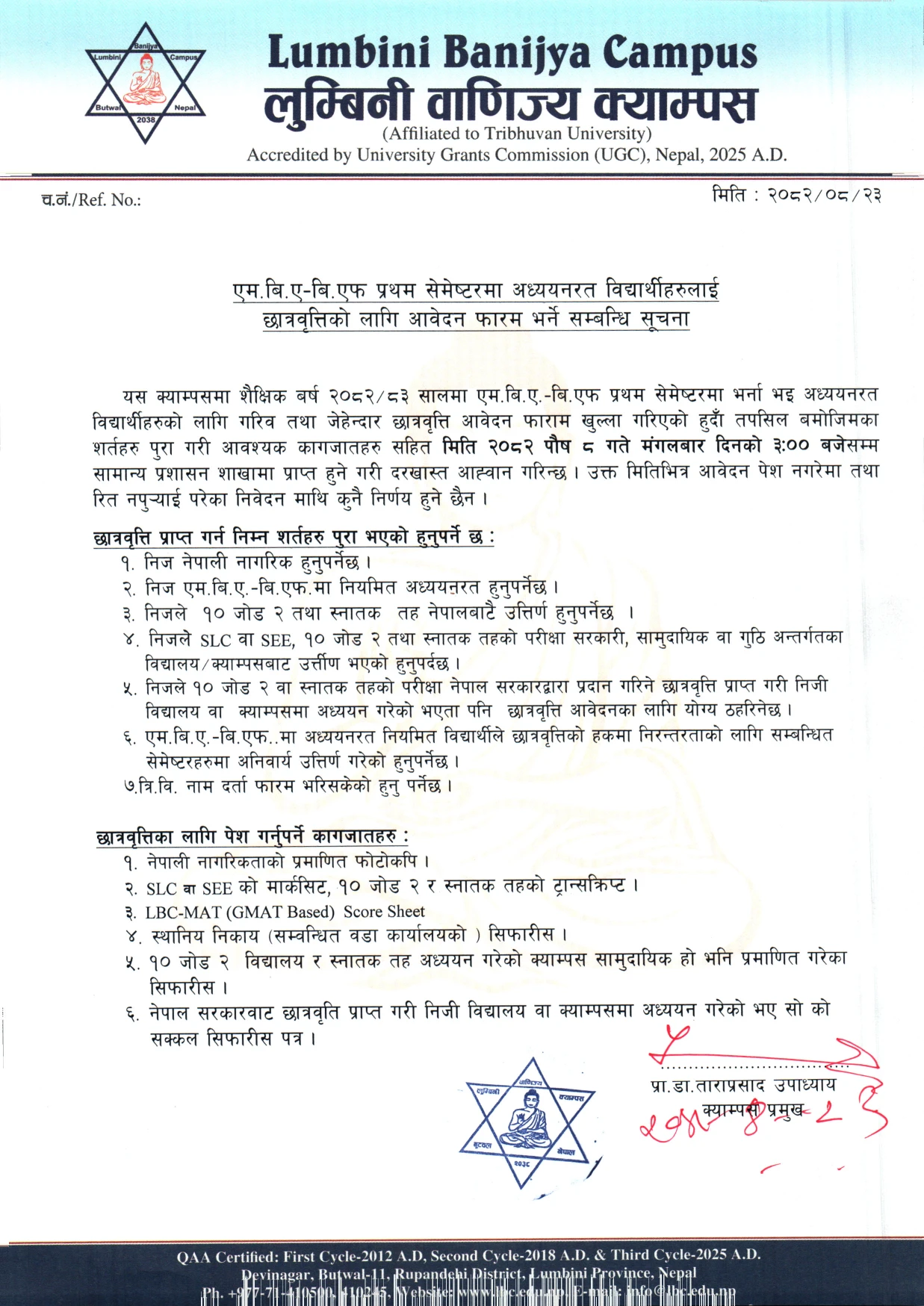 एम.बि. ए - बि.एफ प्रथम सेमेष्टरमा अध्ययनरत विद्यार्थीहरुलाई छात्रवृत्तिको लागि आवेदन फारम भर्ने सम्बन्धि सूचना