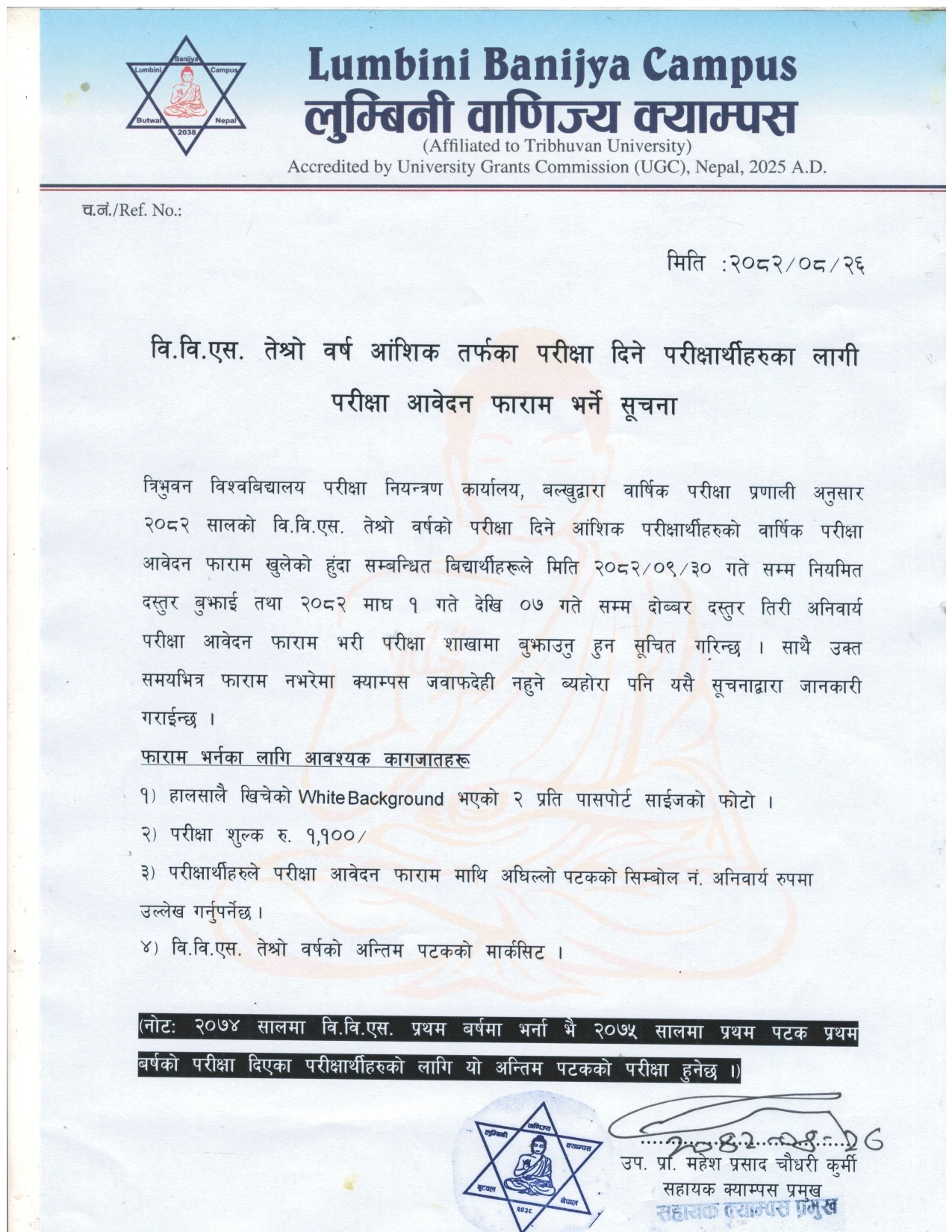 वि.वि.एस. तेश्रो वर्ष आंशिक तर्फका परीक्षा दिने परीक्षार्थीहरुका लागी परीक्षा आवेदन फाराम भर्ने सूचना