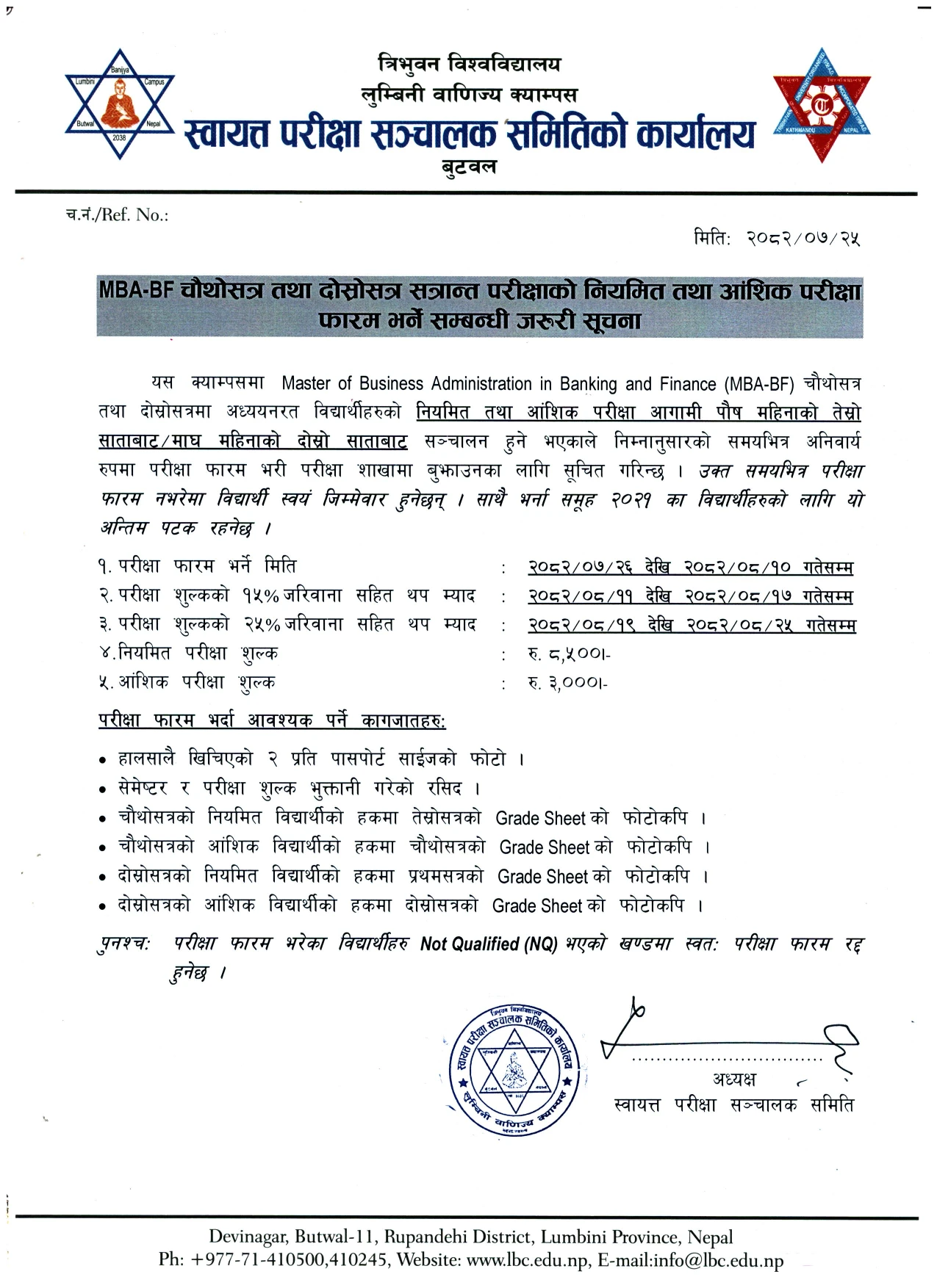 MBA-BF चौथोसत्र तथा दोस्रोसत्र सत्रान्त परिक्षाको नियमित तथा आंशिक परीक्षा फारम भर्ने सम्बन्धी सूचना