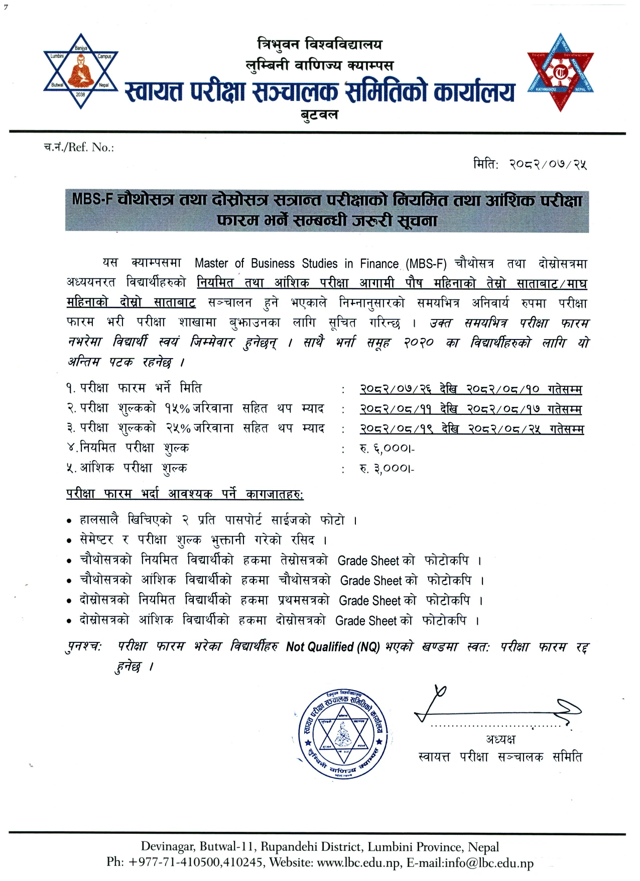 Lumbini Banijya Campus was formally inaugurated on 20th February, 1982. Initially the campus was run in Butwal Municipality Building at Ward No. 1 to run PCL classes in morning shift. Later B.Com classes were started in 1986 with 42 students in first year. The Campus got approval to run MBS classes in 2001 phasing out the PCL. For its quality in academic field the campus got quality accreditation certificate from University Grants Commission Nepal. After the accreditation, the campus was approved to run BBM under the affiliation of T.U. in 2014 and MBA-BF in 2017 as an autonomy. The campus is well equippied with library, e-library, computer labs and all other necessary factors that is required to provide academically sound environment for the students. The Campus is not only dedicated academically but also with field works and research to provide students with practical scenarios of today's business environment.