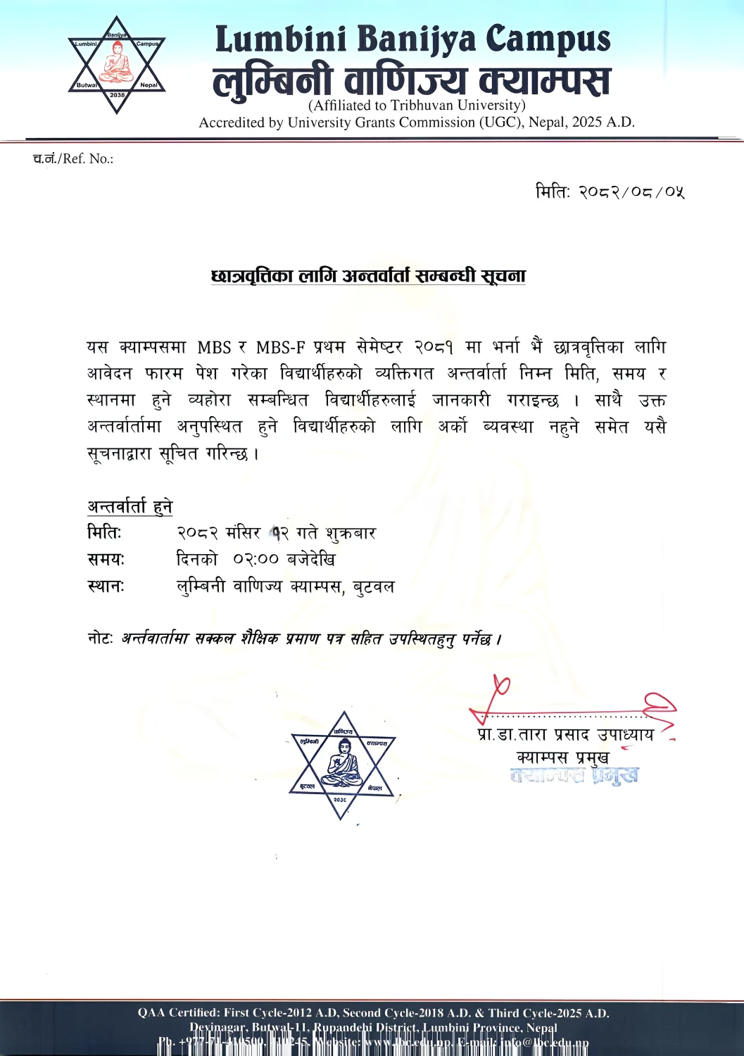 Lumbini Banijya Campus was formally inaugurated on 20th February, 1982. Initially the campus was run in Butwal Municipality Building at Ward No. 1 to run PCL classes in morning shift. Later B.Com classes were started in 1986 with 42 students in first year. The Campus got approval to run MBS classes in 2001 phasing out the PCL. For its quality in academic field the campus got quality accreditation certificate from University Grants Commission Nepal. After the accreditation, the campus was approved to run BBM under the affiliation of T.U. in 2014 and MBA-BF in 2017 as an autonomy. The campus is well equippied with library, e-library, computer labs and all other necessary factors that is required to provide academically sound environment for the students. The Campus is not only dedicated academically but also with field works and research to provide students with practical scenarios of today's business environment.