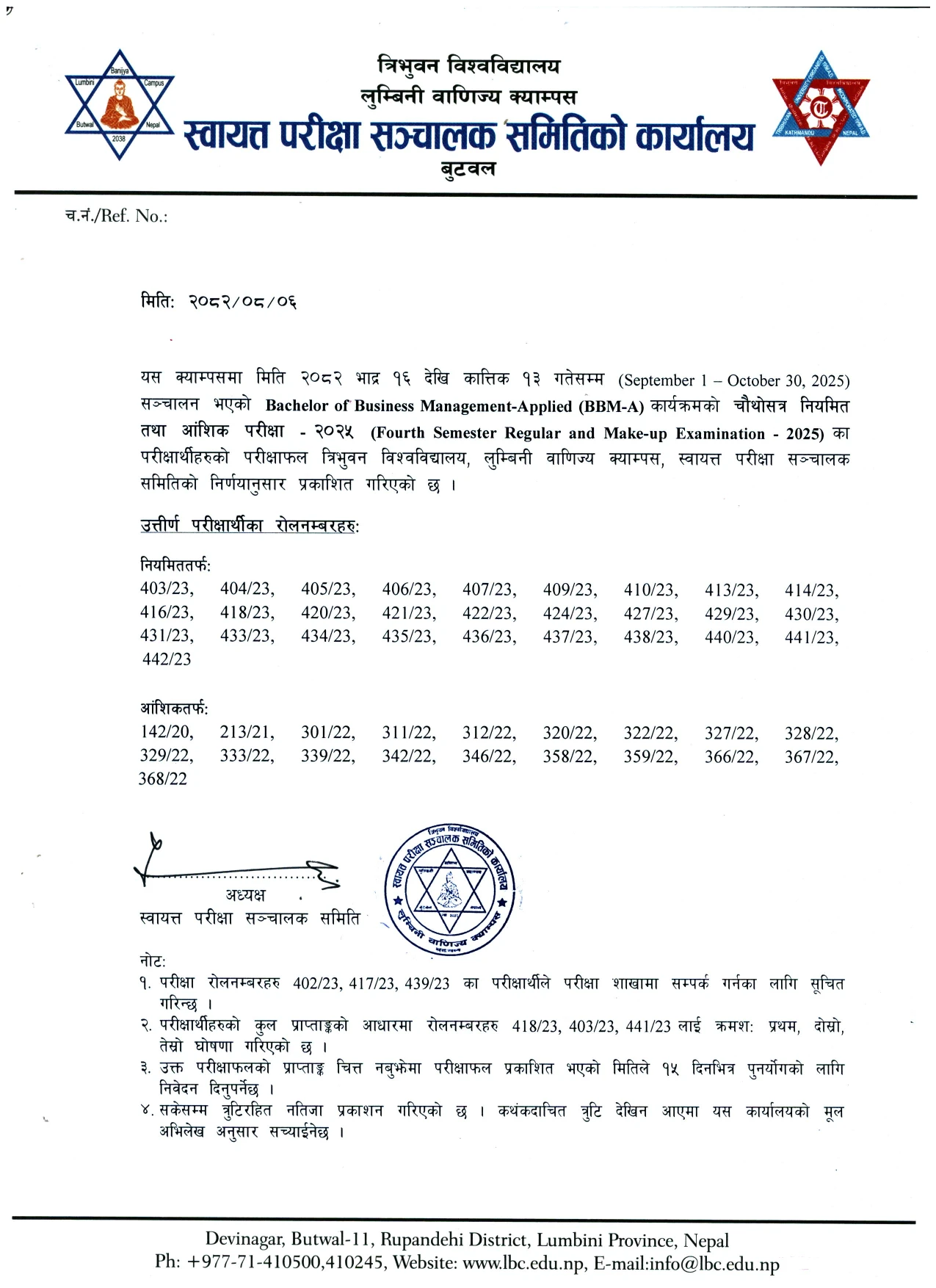 BBM-A कार्यक्रमको चौथोसत्र नियमित तथा आंशिक परीक्षा - २०२५ को परीक्षाफल प्रकाशित