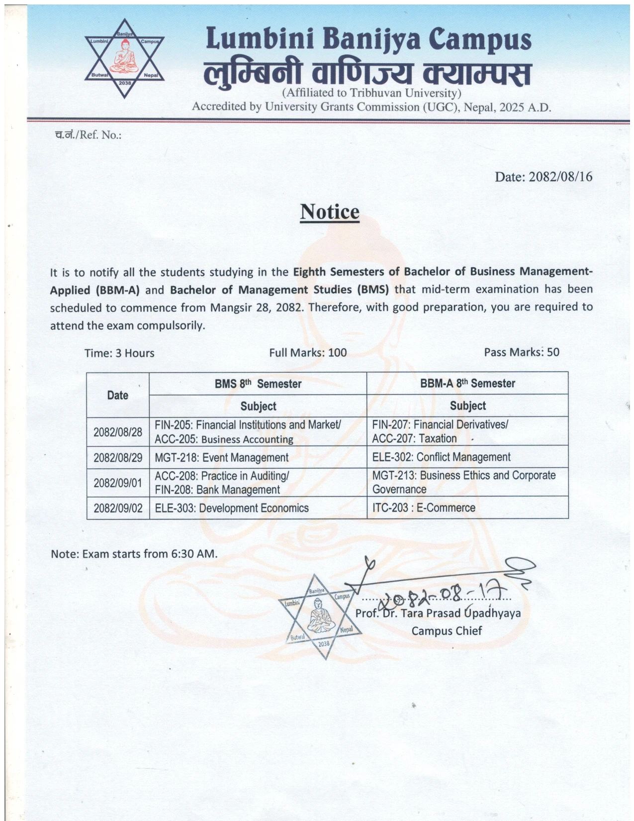 MBS and MBS-F छात्रवृत्ति छनोट सम्बन्धी सूचना MBA-BF (Fall) तेस्रोसत्र तथा प्रथमसत्र सत्रान्त परीक्षाको नियमित तथा आंशिक परीक्षा फारम भर्ने सम्बन्धी सूचना MBA-BF चौथोसत्र नियमित तथा आंशिक परीक्षाको परिक्षा तालिका - २०२६ MBS-F चौथोसत्र नियमित तथा आंशिक परीक्षाको परिक्षा तालिका - २०२६ BMS आठौँसत्र नियमित तथा आंशिक परीक्षाको परिक्षा तालिका - २०२६ BBM-A आठौँसत्र नियमित तथा आंशिक परीक्षाको परिक्षा तालिका - २०२६ BBA-FA आठौँसत्र नियमित तथा आंशिक परीक्षाको परिक्षा तालिका - २०२६ BBS 2nd Year Examination Schedule 2082 BMS AND BBM-A 8TH Semester Mid-Term Examination 2082 BBA-FA 8th Semester Pre-Viva Notice बी.बी.ए–एफ.ए(BBA-FA) आठौँ सेमेस्टरमा अध्ययनरत विद्यार्थीहरूका लागि मध्यावधि (मिड–टर्म) परीक्षाको कार्यतालिका सम्बन्धी जरुरी सूचना। MBS-(Proposal Defense, Pre-Viva र Viva-Voce Examination)सम्बन्धी जरुरी सूचना। बि.बि.एस. दोश्रो बर्षको बार्षिक परीक्षा - २०८२ सम्बन्धी जरुरी सूचना त्रि.वि. नाम दर्ता (Registration) फारम भर्ने म्याद थप सम्बन्धी सूचना BBA-FA कार्यक्रमको चौथोसत्र नियमित तथा आंशिक परीक्षा - २०२५ को परीक्षाफल प्रकाशित BBM-A कार्यक्रमको चौथोसत्र नियमित तथा आंशिक परीक्षा - २०२५ को परीक्षाफल प्रकाशित BMS कार्यक्रमको चौथोसत्र नियमित तथा आंशिक परीक्षा - २०२५ को परीक्षाफल प्रकाशित छात्रवृत्तिका लागि अन्तर्वार्ता सम्बन्धी जरुरी सूचना। MBS-F चौथोसत्र तथा दोस्रोसत्र सत्रान्त परिक्षाको नियमित तथा आंशिक परीक्षा फारम भर्ने सम्बन्धी सूचना MBA-BF चौथोसत्र तथा दोस्रोसत्र सत्रान्त परिक्षाको नियमित तथा आंशिक परीक्षा फारम भर्ने सम्बन्धी सूचना BBA-FA आठौँसत्र सत्रान्त परिक्षाको नियमित तथा आंशिक परीक्षा फारम भर्ने सम्बन्धी सूचना BMS आठौँसत्र सत्रान्त परिक्षाको नियमित तथा आंशिक परीक्षा फारम भर्ने सम्बन्धी सूचना BBM-A आठौँसत्र सत्रान्त परिक्षाको नियमित तथा आंशिक परीक्षा फारम भर्ने सम्बन्धी सूचना मङ्सिर १ गतेदेखि क्याम्पस सञ्चालन हुने समय अपडेट गरिएको सम्बन्धी जरूरी सूचना। Notice Regarding MBS-F 4th Semester Proposal Defense - 2082 Notice Regarding MBS Thesis 2082 LBC BUSINESS INCUBATION PROGRAM 2025 बि.बि.एस. दोश्रो बर्षको स्थगित भएको आंशिक तथा मौका परीक्षा - २०८२ सम्बन्धी जरुरी सूचना Notice Regarding B.B.M 2ND AND 7TH SEMESTER EXAM ROUTINE 2082 Notice Regarding M.B.S SPECIAL CHANCE EXAM ROUTINE 2082 Bachelor of Management Studies (BMS) Second Semester Regular and Makeup Examination Result -2025 Bachelor of Business Management- Applied (BBM-A) Second Semester Regular and Makeup Examination Result -2025 Bachelor of Business Administration in Finance and Accounting (BBA-FA) Second Semester Regular and Makeup Examination Result-2025 BMS 7th Semester Retotaling Result Notice Regarding Revised Exam Schedule for BMS, BBM-A and BBA-FA 4th and 6th Semester प्रथम वर्षको प्रवेश परीक्षाको नतिजा प्रकाशन सम्बन्धी सूचना