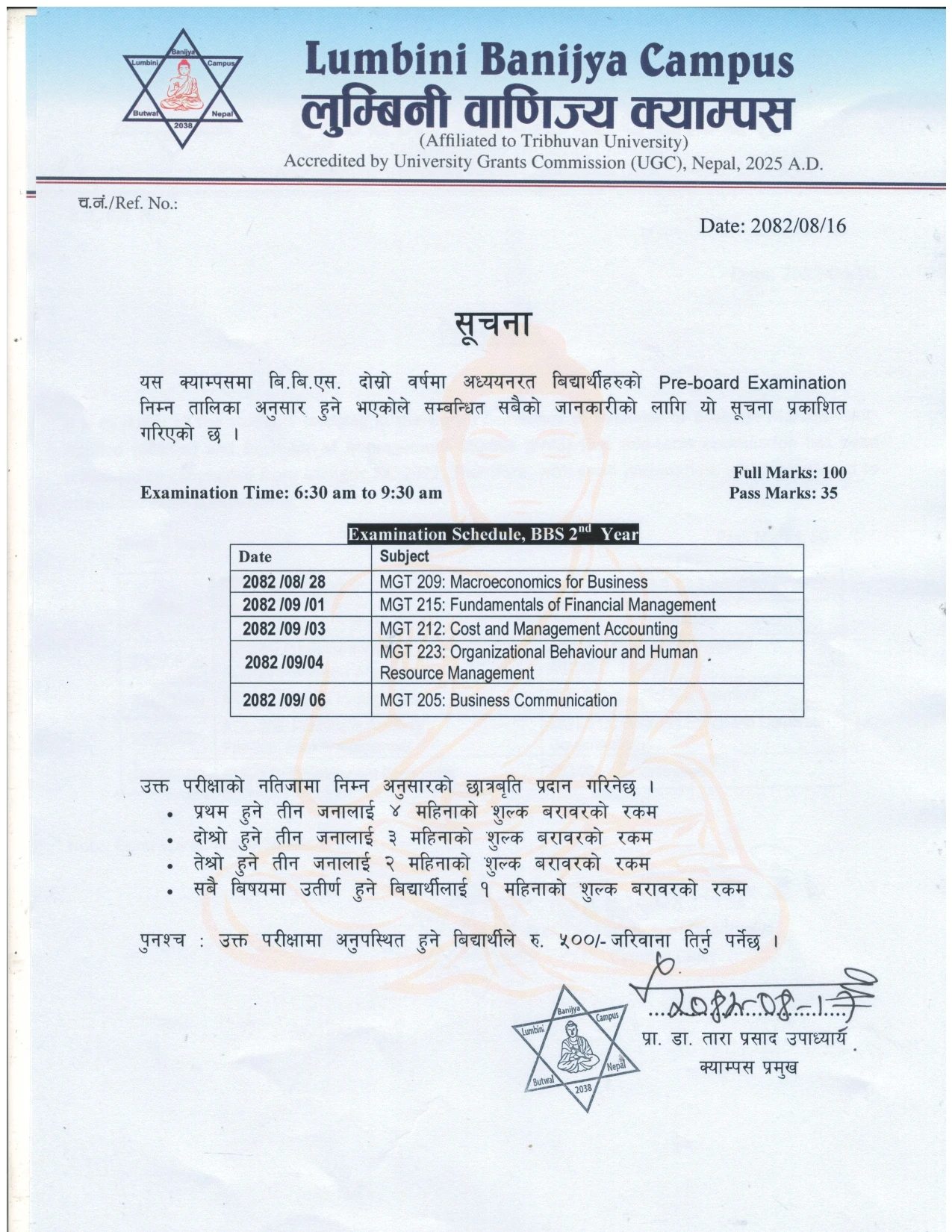MBS and MBS-F छात्रवृत्ति छनोट सम्बन्धी सूचना MBA-BF (Fall) तेस्रोसत्र तथा प्रथमसत्र सत्रान्त परीक्षाको नियमित तथा आंशिक परीक्षा फारम भर्ने सम्बन्धी सूचना MBA-BF चौथोसत्र नियमित तथा आंशिक परीक्षाको परिक्षा तालिका - २०२६ MBS-F चौथोसत्र नियमित तथा आंशिक परीक्षाको परिक्षा तालिका - २०२६ BMS आठौँसत्र नियमित तथा आंशिक परीक्षाको परिक्षा तालिका - २०२६ BBM-A आठौँसत्र नियमित तथा आंशिक परीक्षाको परिक्षा तालिका - २०२६ BBA-FA आठौँसत्र नियमित तथा आंशिक परीक्षाको परिक्षा तालिका - २०२६ BBS 2nd Year Examination Schedule 2082 BMS AND BBM-A 8TH Semester Mid-Term Examination 2082 BBA-FA 8th Semester Pre-Viva Notice बी.बी.ए–एफ.ए(BBA-FA) आठौँ सेमेस्टरमा अध्ययनरत विद्यार्थीहरूका लागि मध्यावधि (मिड–टर्म) परीक्षाको कार्यतालिका सम्बन्धी जरुरी सूचना। MBS-(Proposal Defense, Pre-Viva र Viva-Voce Examination)सम्बन्धी जरुरी सूचना। बि.बि.एस. दोश्रो बर्षको बार्षिक परीक्षा - २०८२ सम्बन्धी जरुरी सूचना त्रि.वि. नाम दर्ता (Registration) फारम भर्ने म्याद थप सम्बन्धी सूचना BBA-FA कार्यक्रमको चौथोसत्र नियमित तथा आंशिक परीक्षा - २०२५ को परीक्षाफल प्रकाशित BBM-A कार्यक्रमको चौथोसत्र नियमित तथा आंशिक परीक्षा - २०२५ को परीक्षाफल प्रकाशित BMS कार्यक्रमको चौथोसत्र नियमित तथा आंशिक परीक्षा - २०२५ को परीक्षाफल प्रकाशित छात्रवृत्तिका लागि अन्तर्वार्ता सम्बन्धी जरुरी सूचना। MBS-F चौथोसत्र तथा दोस्रोसत्र सत्रान्त परिक्षाको नियमित तथा आंशिक परीक्षा फारम भर्ने सम्बन्धी सूचना MBA-BF चौथोसत्र तथा दोस्रोसत्र सत्रान्त परिक्षाको नियमित तथा आंशिक परीक्षा फारम भर्ने सम्बन्धी सूचना BBA-FA आठौँसत्र सत्रान्त परिक्षाको नियमित तथा आंशिक परीक्षा फारम भर्ने सम्बन्धी सूचना BMS आठौँसत्र सत्रान्त परिक्षाको नियमित तथा आंशिक परीक्षा फारम भर्ने सम्बन्धी सूचना BBM-A आठौँसत्र सत्रान्त परिक्षाको नियमित तथा आंशिक परीक्षा फारम भर्ने सम्बन्धी सूचना मङ्सिर १ गतेदेखि क्याम्पस सञ्चालन हुने समय अपडेट गरिएको सम्बन्धी जरूरी सूचना। Notice Regarding MBS-F 4th Semester Proposal Defense - 2082 Notice Regarding MBS Thesis 2082 LBC BUSINESS INCUBATION PROGRAM 2025 बि.बि.एस. दोश्रो बर्षको स्थगित भएको आंशिक तथा मौका परीक्षा - २०८२ सम्बन्धी जरुरी सूचना Notice Regarding B.B.M 2ND AND 7TH SEMESTER EXAM ROUTINE 2082 Notice Regarding M.B.S SPECIAL CHANCE EXAM ROUTINE 2082 Bachelor of Management Studies (BMS) Second Semester Regular and Makeup Examination Result -2025 Bachelor of Business Management- Applied (BBM-A) Second Semester Regular and Makeup Examination Result -2025 Bachelor of Business Administration in Finance and Accounting (BBA-FA) Second Semester Regular and Makeup Examination Result-2025 BMS 7th Semester Retotaling Result Notice Regarding Revised Exam Schedule for BMS, BBM-A and BBA-FA 4th and 6th Semester प्रथम वर्षको प्रवेश परीक्षाको नतिजा प्रकाशन सम्बन्धी सूचना