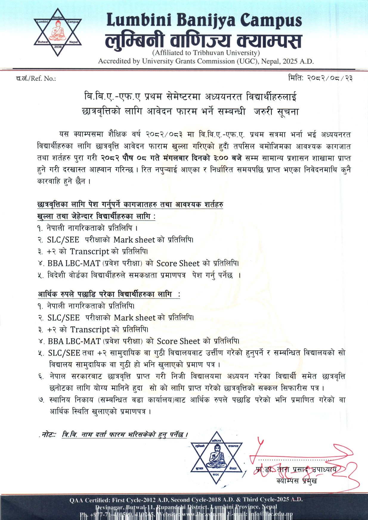 बि.बि.ए. एफ. ए प्रथम सेमेष्टरमा अध्ययनरत विद्यार्थीहरुलाई छात्रवृत्तिको लागि आवेदन फारम भर्ने सम्बन्धी जरुरी सूचना